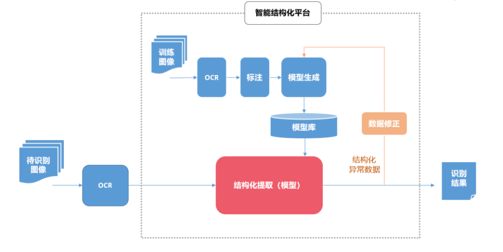 在易道博識智能結構化平臺中,會提前將訓練圖像通過OCR和標注,生成數據模型并集成模型庫,用于應對生產中的結構化提取。如果過程中出現異常數據,平臺會自動將數據抓取并修正,重新進行模型生成,完成一個內部閉環。并且根據閉環進行模板自行調整,不斷提升結構化水平。