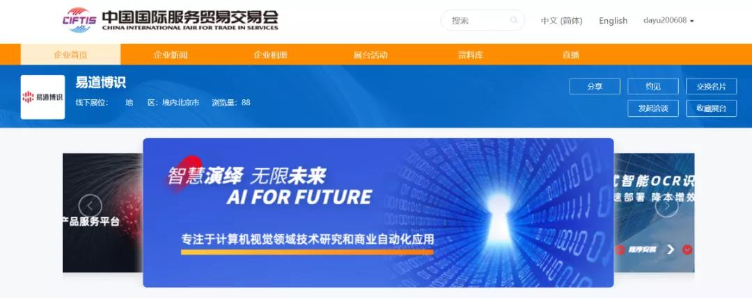9月2日,備受矚目的2021年中國國際服務貿易交易會(簡稱服貿會)在北京拉開帷幕。易道博識攜AI開放平臺與眾多AI+智能OCR識別解決方案以線上展位的形式出席展會。