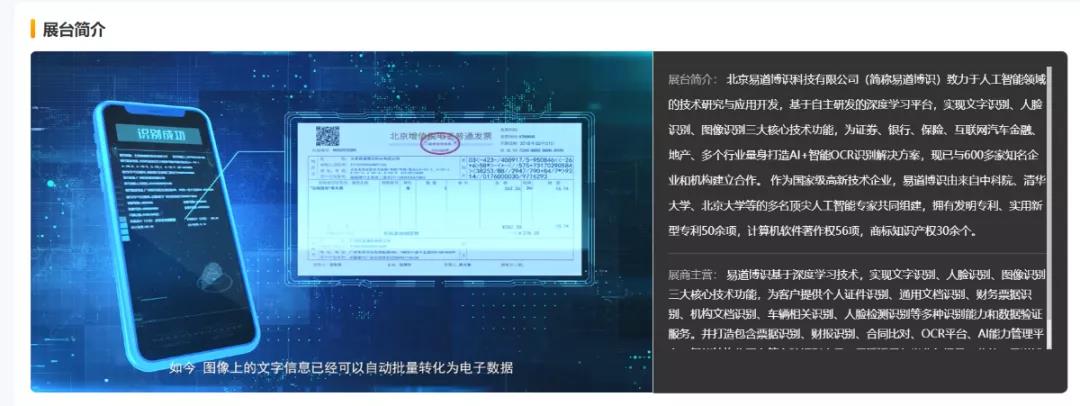 此外,服務展品中還有AI+證券、AI+銀行、AI+保險等多個行業解決方案。作為金融領域合作覆蓋范圍最廣、方案最成熟、識別產品最豐富的人工智能企業之一, 易道博識為證券、銀行、保險、互聯網、汽車金融、地產多個行業量身打造AI+智能OCR識別解決方案,現已與600多家知名企業和機構建立合作,并且憑借多年的服務經驗在數據采集到質檢各環節中建立了競爭壁壘,在定制開發和專屬服務方面均具有穩定優勢。