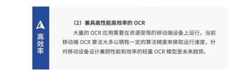 國內首份OCR白皮書《智能文字識別(OCR)能力測評與應用白皮書》中指出:大量的OCR應用需要在資源受限的移動端設備上運行,當前移動端OCR算法大多以犧牲一定的算法精度來換取運行速度,針對移動設備設計兼顧性能和效率的輕量OCR模型將是未來發展的重要方向。