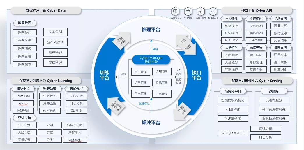 賽博(Cybot)學(xué)習(xí)平臺(tái)(簡(jiǎn)稱平臺(tái))是易道博識(shí)基于深度學(xué)習(xí)自主研發(fā)的一站式全周期數(shù)據(jù)服務(wù)平臺(tái)。平臺(tái)包含Cyber Data數(shù)據(jù)標(biāo)注平臺(tái)、Cyber Learning深度學(xué)習(xí)訓(xùn)練平臺(tái)、Cyber Serving深度學(xué)習(xí)推理平臺(tái)、Cyber API 接口平臺(tái)、Cyber Manager管理平臺(tái)5大平臺(tái),涵蓋數(shù)據(jù)標(biāo)注,數(shù)據(jù)訓(xùn)練、推理服務(wù)三大數(shù)據(jù)服務(wù)環(huán)節(jié)。