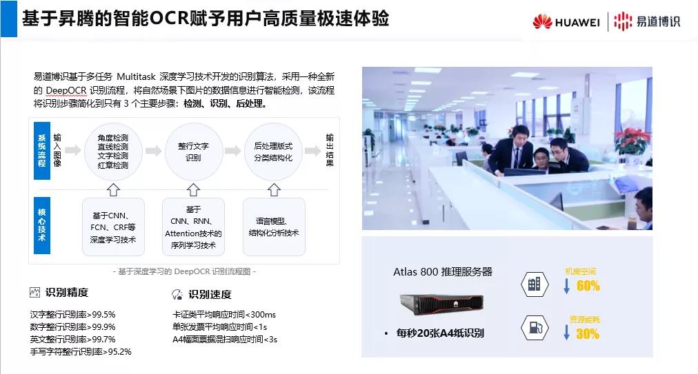 其中,在易道博識(shí)和華為昇騰合作開發(fā)的Atlas系列推理服務(wù)器中,易道博識(shí)的Deep OCR深度學(xué)習(xí)核心算法,為Atlas 800推理服務(wù)器提供了“每秒20張A4紙”量級(jí)的文本識(shí)別能力,因性能提高帶來的資源節(jié)省使得機(jī)房空間下降了60%,資源能耗下降了30%。