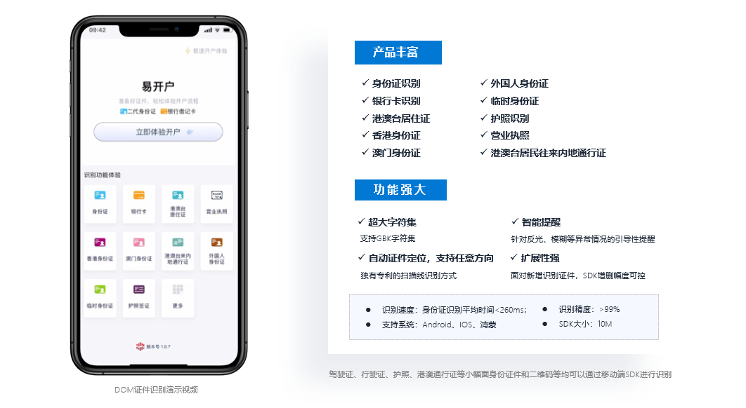 DOM SDK的市場需求非常大,證券開戶,銀行開戶,投保理賠,汽車金融……等大量應用卡證識別,且移動端需求量極大的業務,都是DOM SDK的應用場景。這些場景對識別速度、識別精度的要求非常高,客戶容忍度低,注重用戶體驗,對產品的魯棒性要求很高。