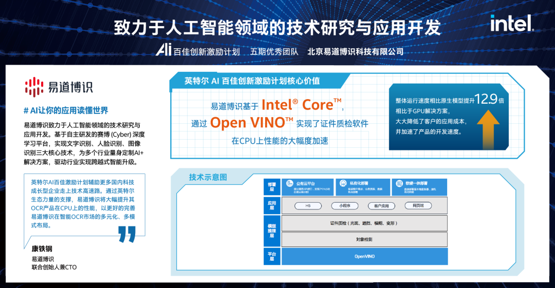 這是一場(chǎng)由英特爾AI百佳創(chuàng)新計(jì)劃(2021 AI 100 Connect Webinar)邀請(qǐng)一眾行業(yè)專家圍繞AI+企業(yè)數(shù)字化轉(zhuǎn)型展開的線上分享會(huì)。有資格被邀請(qǐng)參會(huì)的企業(yè)寥寥無幾,因?yàn)檫@意味著他們還要擁有另一個(gè)身份:在和英特爾的技術(shù)合作下取得了行業(yè)的重大創(chuàng)新和突破。