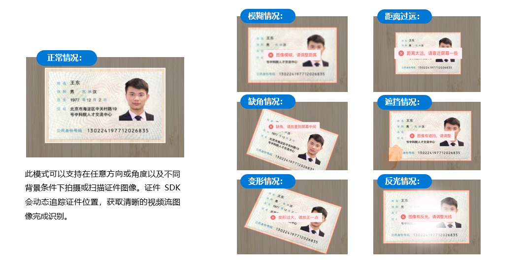 “證件質(zhì)檢,顧名思義就是證件的質(zhì)量檢測(cè)。在證件識(shí)別的拍攝過程中,由于環(huán)境和拍攝的影響,難免會(huì)出現(xiàn)反光、證件被遮擋、圖像模糊等異常情況。而證件質(zhì)檢就是檢測(cè)這些異常情況并瞬間反饋提示的功能。”