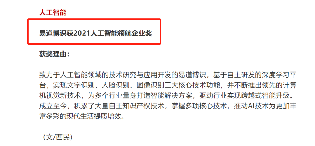 12月18日,由中國科學院《互聯網周刊》、中國社會科學院信息化研究中心、eNet研究院、德本咨詢聯合主辦的2021(第十九屆)中國互聯網經濟論壇正式拉開帷幕,備受矚目的年度金i獎獲獎名單也最終揭曉。易道博識憑借業界領先的產品創新及用戶服務,成功獲評“2021人工智能領航企業獎”。