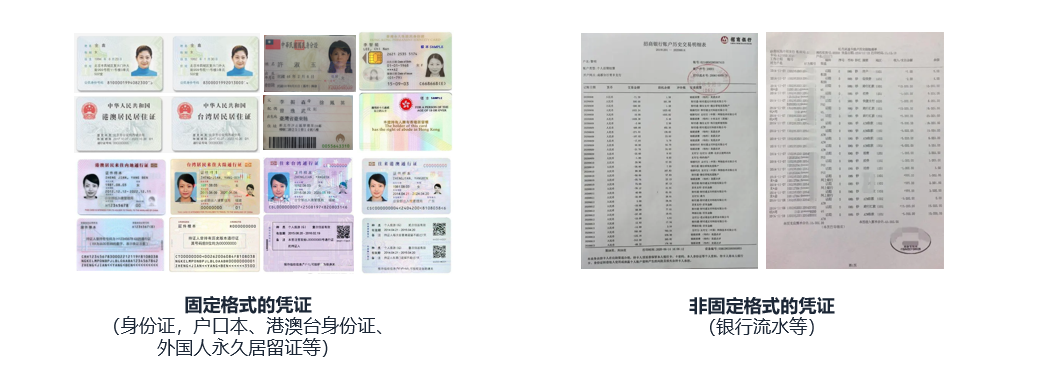 隨著金融業(yè)務的發(fā)展,越來越多的業(yè)務線中涉及的紙質(zhì)憑證影像需要用到OCR自動處理,來進一步提升業(yè)務辦理的效率。從企業(yè)內(nèi)部的數(shù)據(jù)類型來看,這些憑證影像按照格式可以分為兩類:一類是固定格式的憑證(戶口本、港澳臺身份證、外國人永久居留證等),占整體90%以上;一類是非固定格式的憑證(銀行流水等)。這些憑證存在以下特點: