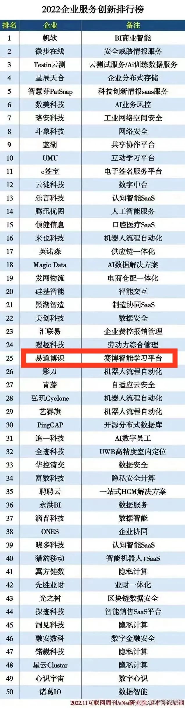 11月4日,由互聯(lián)網周刊、eNet研究院聯(lián)合調研發(fā)布的2022企業(yè)服務創(chuàng)新排行榜正式公布,國內知名OCR智能識別與數據服務提供商易道博識憑借“賽博智能學習平臺”成功上榜,成為OCR領域唯一入選企業(yè)。