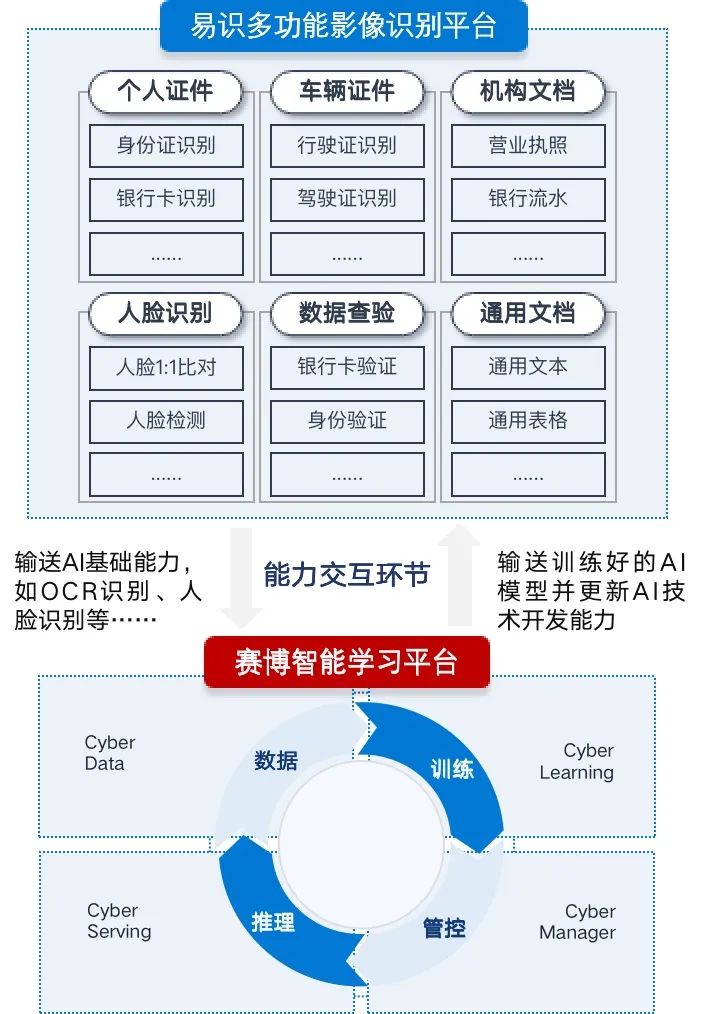 金融、通信、能源等行業(yè)企業(yè)在運營中除了有大量標準OCR識別需求外,還會因業(yè)務流程的優(yōu)化、產品的變更產生大量不同版式的OCR識別需求。由于數據的敏感性,很多企業(yè)無法將業(yè)務數據交給技術服務商進行AI識別模型的訓練與推理。為了滿足客戶特殊需求,易道博識基于深度學習技術打造一站式機器學習訓練應用平臺——“賽博智能學習平臺”。該平臺集數據管理、數據標注、模型訓練和模型部署應用功能于一身,通過API接口導入業(yè)務數據,經過少量樣本數據訓練自學習生成標準的OCR識別模型供業(yè)務系統(tǒng)調用。