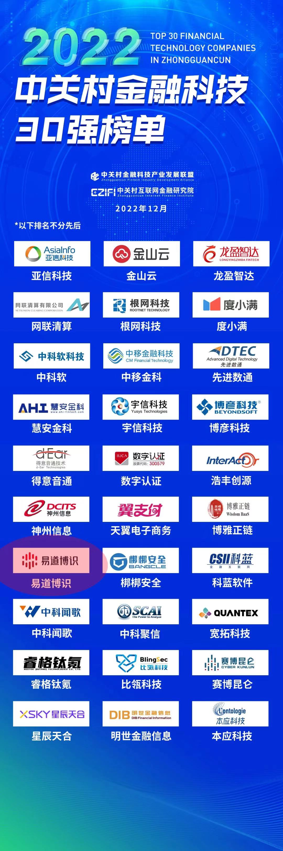 “2022年30強榜單”面向致力于通過金融科技前沿技術,包括人工智能、大數據、互聯技術(移動互聯、物聯網)、分布式技術(云計算、區塊鏈)、安全技術(密碼技術、量子計算、生物識別)等提升金融監管效率、改造或創新金融產品、改善金融服務提供方式的新技術企業、互聯網企業等。本次評選著重關注金融科技企業的核心技術突破,全面綜合地反映中關村金融科技企業的綜合實力。