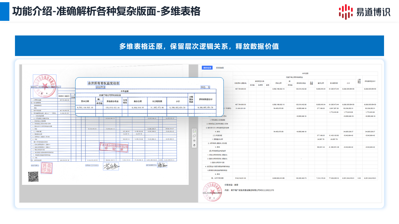 針對財報中常見的多級表頭、嵌套單元格等“多維表格”,易道博識智能文檔解析系統(tǒng)能夠深入解析其復雜的層級與隸屬關(guān)系。它不僅是提取數(shù)據(jù),更是完整保留了數(shù)據(jù)之間的層次邏輯,將復雜的表格轉(zhuǎn)化為機器可讀的結(jié)構(gòu)化數(shù)據(jù)(如JSON),真正釋放了深藏于表格中的數(shù)據(jù)價值。