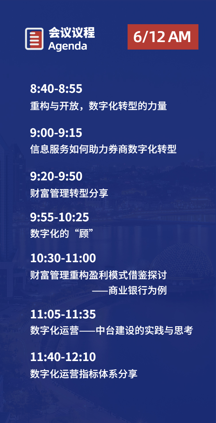 針對此類問題,本次大會設分享和閉門議題討論兩部分,討論的主要議題包括:券商財富管理業務轉型模式探討;證券業數字化轉型的思考;營銷端場景的現狀與思考等。