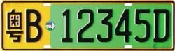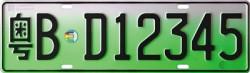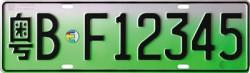 綠底的為新能源汽車專用號(hào)牌,新能源汽車號(hào)牌為漸變綠色,大型新能源汽車號(hào)牌為黃綠雙拼色(地區(qū)代碼部分為黃色,號(hào)碼部分為綠色)。