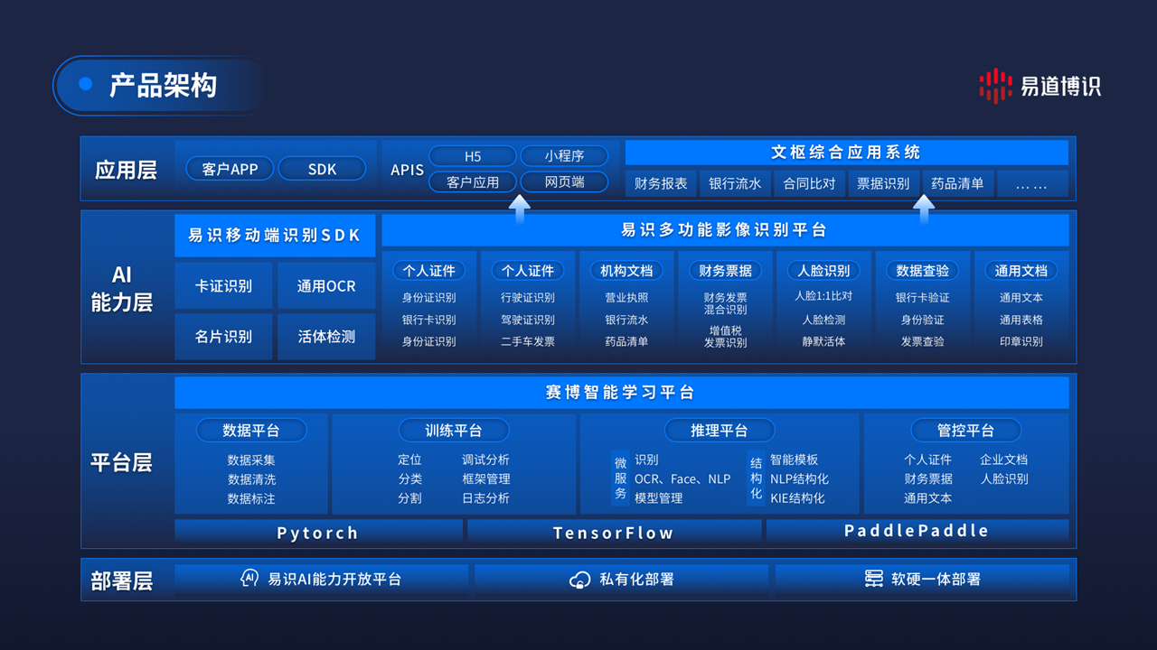 作為一家主要服務金融行業客戶的人工智能企業,易道博識圍繞計算機視覺、自然語言處理兩大技術方向,打造“易識”、“賽博”、“文樞”三大產品體系,為客戶提供多種標準卡證識別產品、機器學習平臺與大模型產品、多款專業文檔識別與數據處理產品,廣泛服務于銀行、券商、保險機構在遠程開戶、集中運營、智能審核、影像管理、盡職調查、投保理賠、內部運營管理等眾多業務場景,為金融客戶打造基于AI模型全生命周期的一體化生產運營體系。