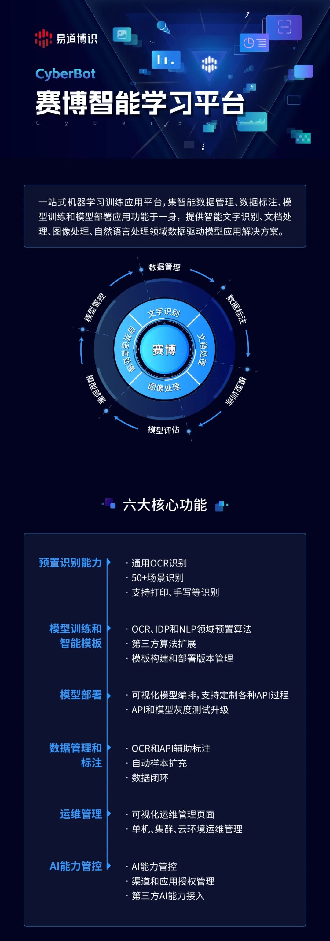 賽博智能平臺預置50+場景標準憑證的OCR識別模板。此外,根據不同客戶的業務場景以及特殊版式文件識別需求,銀行可自主完成數據標注、模型訓練、推理、部署、應用全過程,低成本、短周期建立符合業務需求的AI模型。通過賽博智能平臺,該行完成了包含電匯憑證、轉賬支票、進賬單等10余種銀行表單的結構化模型訓練。