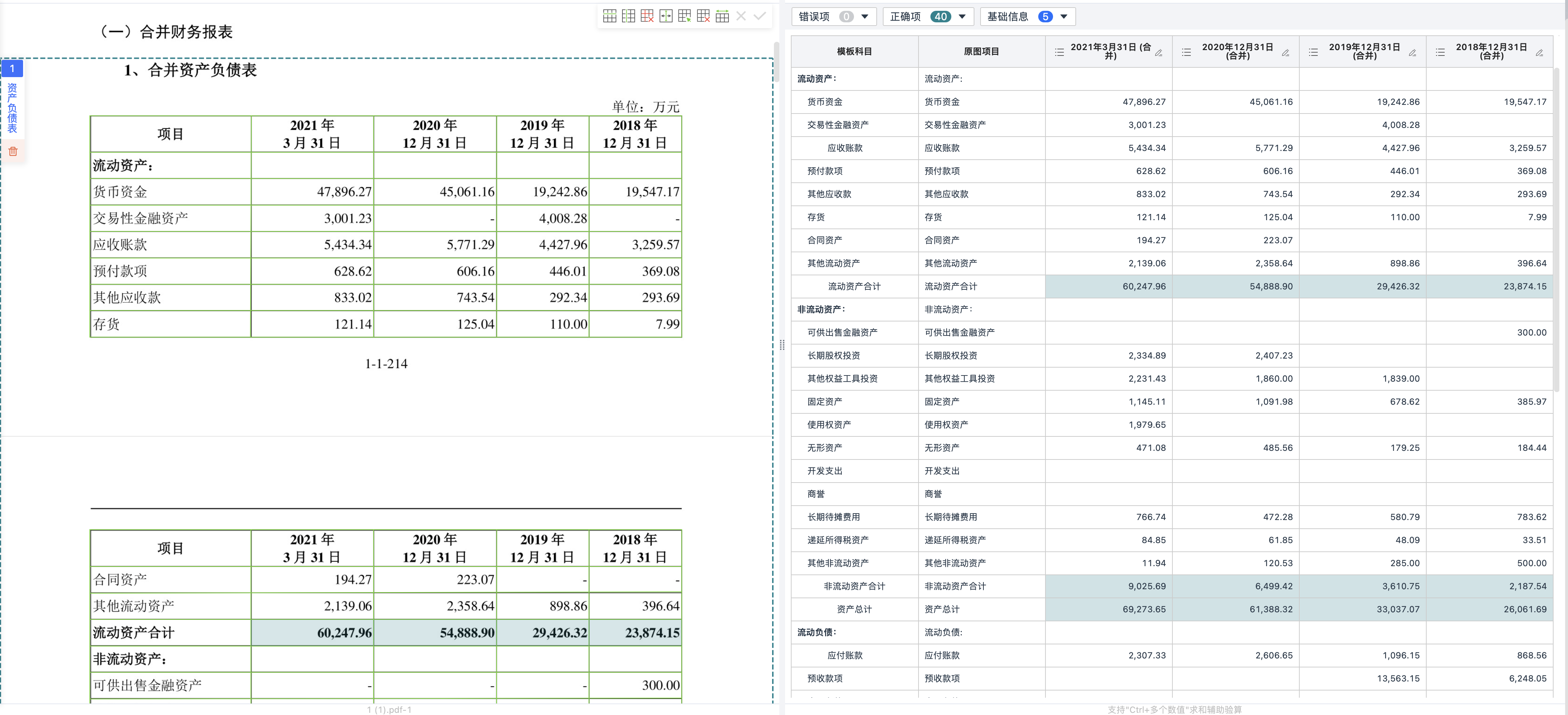 在解析完成后,通過智能數據自動化處理引擎,自動完成財報數據配平與校驗,準確率達99.5%,而且系統自動基于財務科目間勾稽關系輔助核算,自動校驗,對相關數據高亮顯示,科目數值可相互定位對照顯示,方便手動修正,進一步提升識別準確率。