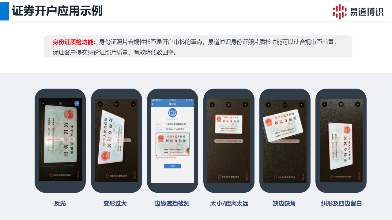 特別是在證券開戶流程中,易道博識創新性地前置了身份證圖片審核和存管賬戶審核。當用戶上傳身份證和銀行卡圖片時,系統即可進行合規性檢查,自動退回不合規照片,無需后臺人工審核。該技術將用戶上傳圖片的成功率從不足50%提升至95%以上,顯著提高了客戶的開戶通過率和用戶體驗。