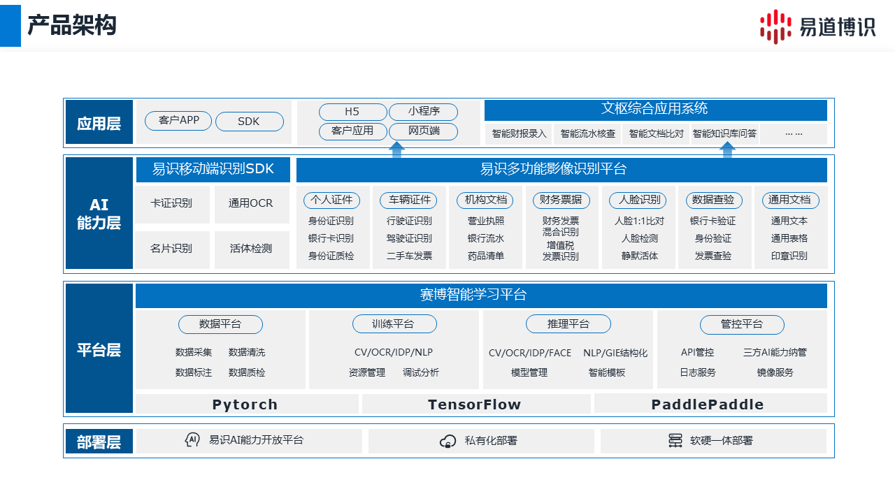 易道博識自2013年成立以來,始終致力于人工智能領(lǐng)域的技術(shù)研究與應(yīng)用開發(fā),通過自主研發(fā)的智能文字識別、智能文檔處理、智能圖像處理和自然語言處理四大核心技術(shù),主要產(chǎn)品包括“易識”——標(biāo)準(zhǔn)化智能識別產(chǎn)品集群、“賽博”——一站式機器學(xué)習(xí)平臺和“文樞”——文檔識別與數(shù)據(jù)深度應(yīng)用系統(tǒng),形成了完整的AI全棧解決方案。目前易道博識已為數(shù)百家金融機構(gòu)、通信、能源、地產(chǎn)等眾多行業(yè)大客戶提供智能化產(chǎn)品與服務(wù)。