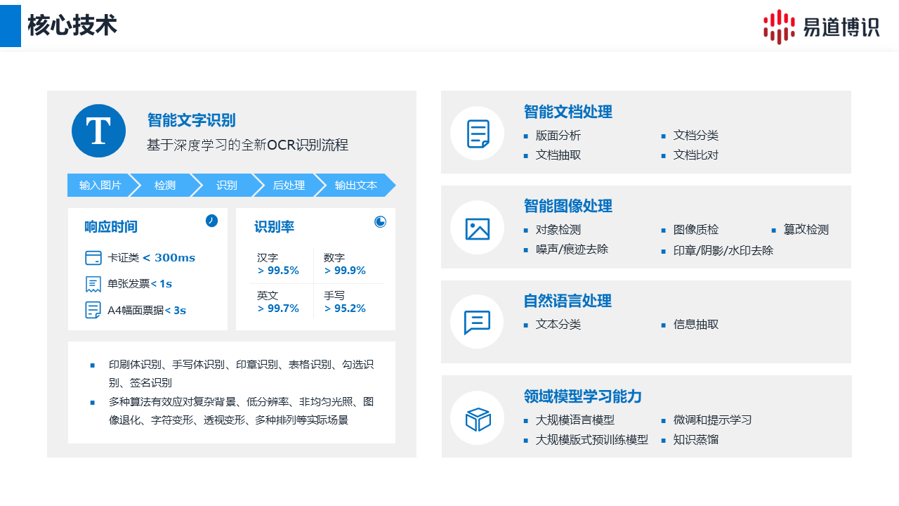 “易識”產品線不僅僅包括身份證識別,還涵蓋了多種智能識別產品,該平臺支持7大類、50多種標準的智能識別產品,包括卡證識別、票據識別、文檔識別、人臉識別等,可以滿足各種業務場景的需求。易道博識的產品支持私有化部署、軟硬一體部署以及調用API接口的形式,靈活應對不同客戶的需求和場景。