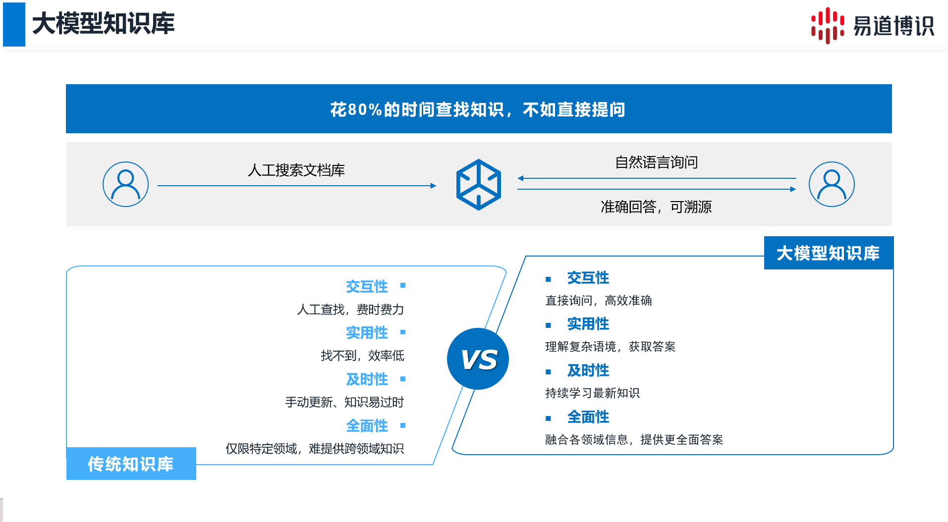 在文檔識別領域取得突破之外,康鐵鋼還介紹了易道博識大模型在企業(yè)知識管理中的應用。金融行業(yè)是信息和知識高度密集的領域,如何通過科技手段提升知識管理的效率和質量,是企業(yè)亟需解決的問題。易道博識的大模型知識庫是一款基于大語言模型的智能化知識管理與應用產品,旨在幫助企業(yè)實現(xiàn)高效的知識管理、知識檢索和知識問答??佃F鋼進一步指出,傳統(tǒng)的文件存儲方式難以快速采集、組織和應用知識,導致知識管理效率低下,而通過大模型知識庫,企業(yè)可以有效整合各部門的知識文檔,實現(xiàn)信息共享,消除知識孤島。同時,大模型知識庫具備自動學習與實時更新的功能,確保知識的時效性和準確性,為企業(yè)提供動態(tài)的知識支持。