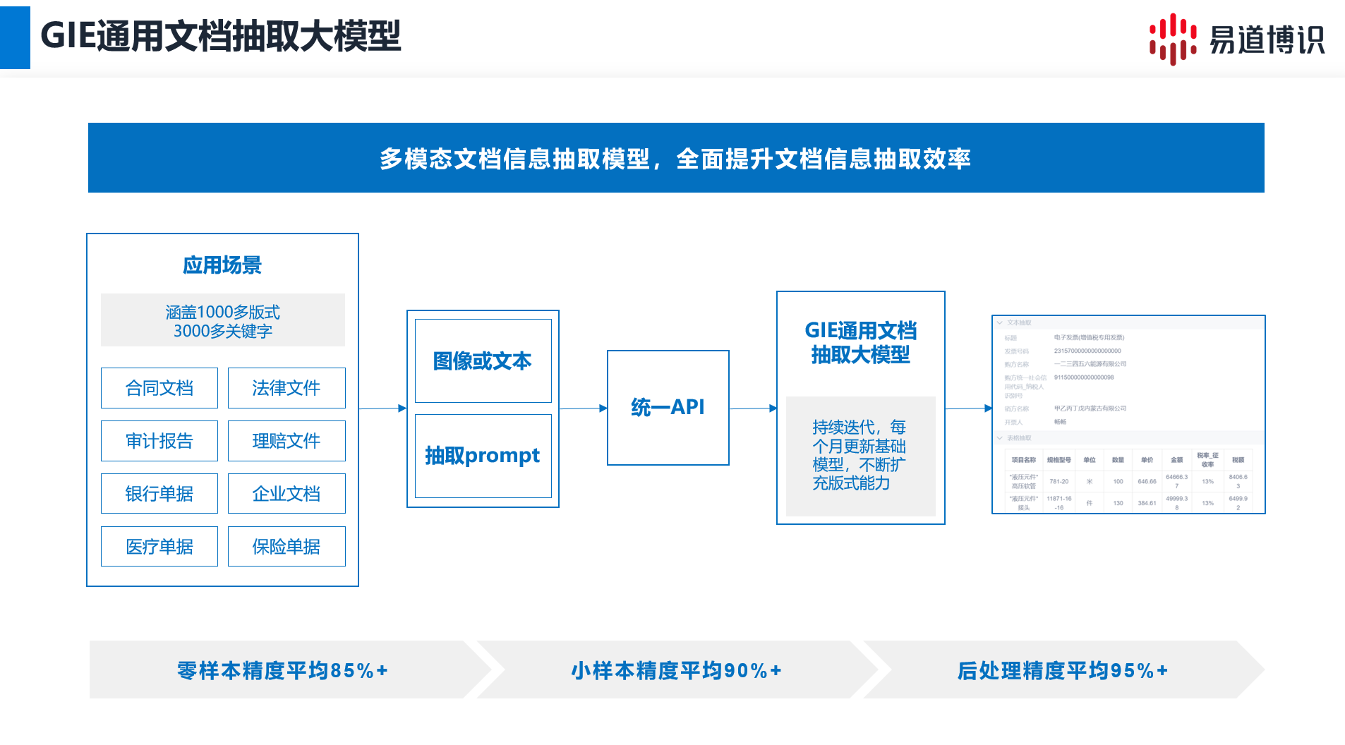 康鐵鋼提到,大模型與小模型的結合是解決金融領域低頻場景文檔識別難題和優(yōu)化高頻場景處理的關鍵。金融機構在處理卡證、票據(jù)、表格等文檔資料時,傳統(tǒng)的小模型在常見文檔的識別精度上表現(xiàn)良好,但面對新格式文檔時,往往需要重新訓練模型,這不僅成本高昂,效率也較低。為解決這一痛點,易道博識推出了GIE(General Information Extraction)通用文檔抽取大模型,結合大模型的泛化能力和小模型的精準度,利用統(tǒng)一的Prompt格式實現(xiàn)高效的信息抽取。不僅能提升高頻場景中的識別精度,還能應對低頻或未知場景,從而大幅降低模型開發(fā)與訓練成本。