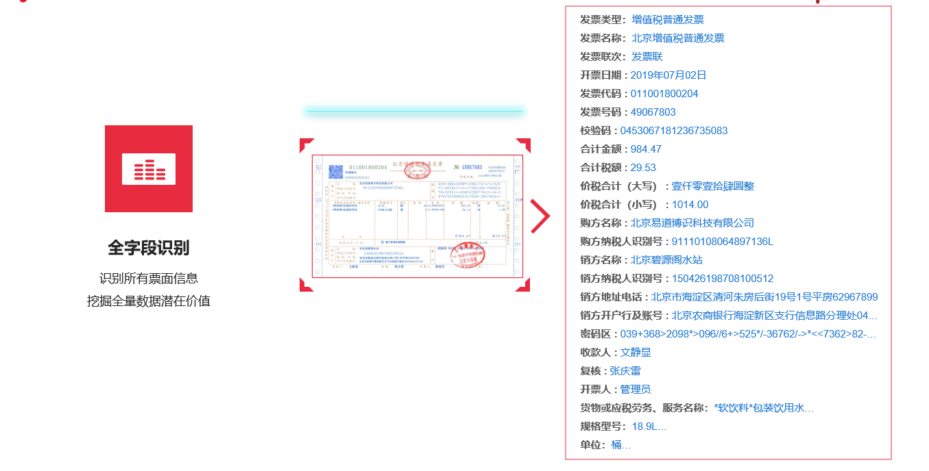 易道博識發票識別準確率可以達到99。5%以上。,并實現毫秒級識別(300毫秒),對于復雜發票,可以使用GIE大模型(OCR大模型)直接識別,準確提取任意復雜版式票據。