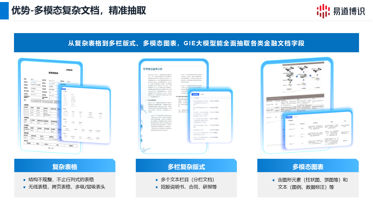 為解決上述問題,易道博識推出了GIE(通用信息抽?。┐竽P?,實現(xiàn)了從“文本識別”到“內(nèi)容理解”的轉(zhuǎn)變。它能深度解析文檔的版面布局、邏輯結(jié)構(gòu)和元素關(guān)聯(lián),實現(xiàn)對任意版式文檔的信息抽取。