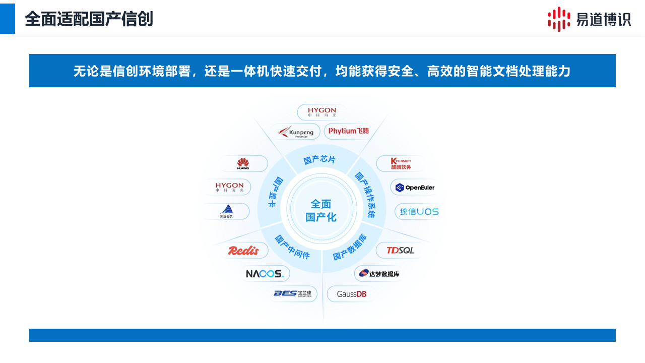 更關鍵的是,易道博識的整套方案已全面適配國產信創體系,能與主流國產芯片、服務器、操作系統無縫融合,確保了金融數據處理方案的高安全性和高可靠性。