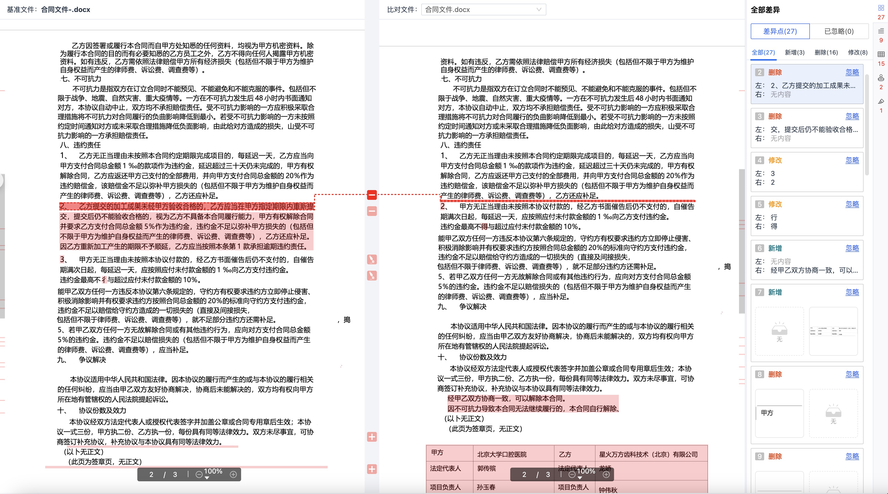 ●系統作用: 系統能清晰對比出新舊版本中違約責任條款的差異。識別出顯失公平的修改。